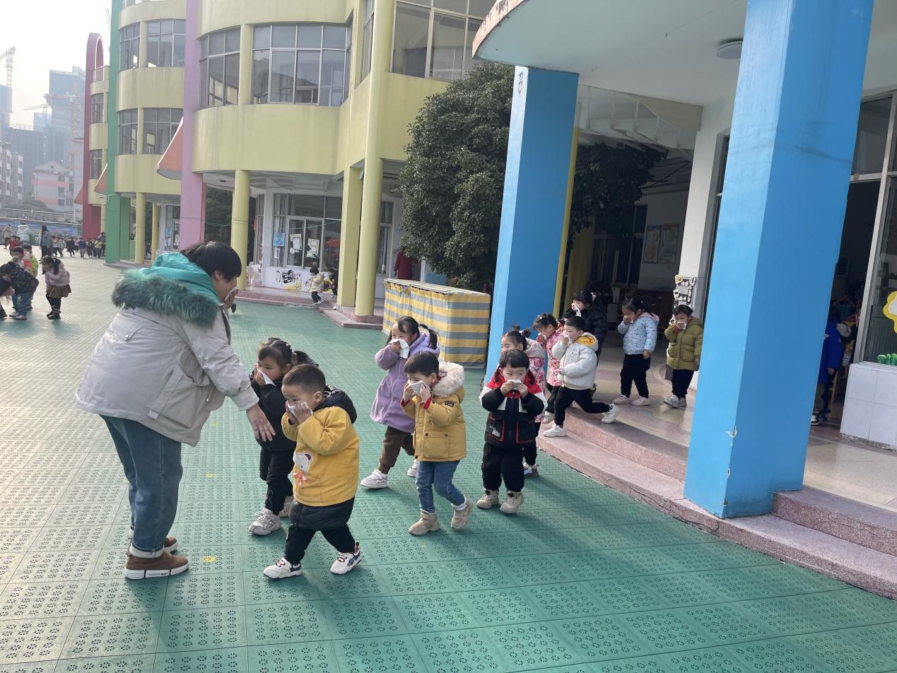 撤离到安全地带后,各班教师立即清点幼儿人数并维持好秩序,同时向负责人汇报班级撤离情况,确保每位幼儿安全撤离,无一人遗漏。